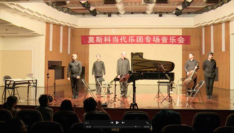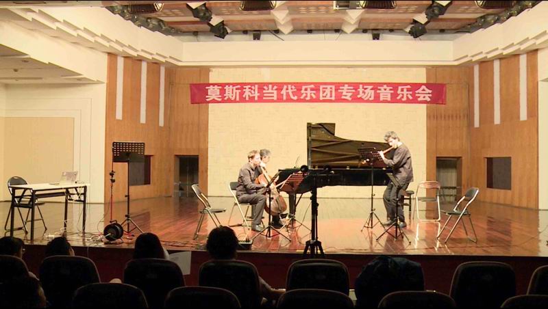 莫斯科现代音乐乐团受俄罗斯文化部支持,在俄罗斯著名作曲家爱迪生•丹尼索夫的资助下由尤里•卡斯帕罗夫于1990年组建成立。该乐团致力于传播俄罗斯二十世纪、二十一世纪风格音乐,是目前俄罗斯境内最为前沿的现代乐团。在这次音乐会中,他们以精湛的技术、良好的默契和严谨的工作态度让现场的老师和同学为之折服。