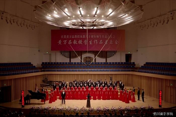 当晚,演出过程中高潮迭起,演出也在观众们的连绵不断的掌声中落下帷幕。此次音乐会展示了黄万品教授从教六十年来辛勤耕耘的结下的累累硕果,也是一代又一代川音人在教育事业艰苦奋斗的缩影。晚会最后,黄万品教授及其学生代表、作曲家们来到台上合影留念,音乐会也在欢乐、祥和的氛围中画下了圆满的句号。祝愿黄老先生接下来的生活中康乐、如意!。
