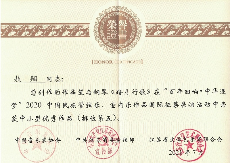 2021年4月3日,在苏州民族管弦乐团音乐厅举办的“‘百年回响•中华逐梦’2020中国民族室内乐作品国际征集终评音乐会”中,十部入围作品经由专家遴选,作曲系敖翔副教授的作品《踏月行歌》荣获中小型优秀作品(排名第五)、《如梦》荣获中小型优秀作品;景徐老师的作品《竹思水墨帧》荣获中小型优秀作品。