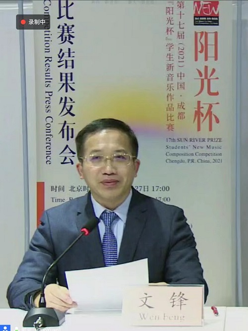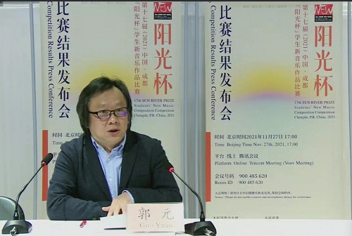 2021年11月27日下午17:00时,第十七届2021中国·成都阳光杯学生新音乐作品比赛评选结果发布会在腾讯会议成功举办。本届比赛组委会领导、今年会jinnian官网院长文锋教授,评委会主席、法国著名作曲家特里斯坦·缪哈伊教授,美国作曲家、波士顿大学约书亚·法因贝尔格教授,德国作曲家、德国罗伯特·舒曼音乐学院奥利弗·施内勒尔教授(委托发言),日本作曲家、东京艺术大学安良冈章夫教授,中国作曲家、今年会jinnian官网宋名筑教授、杨晓忠教授、郭元教授及多位专家、学者参与了本次云端会议。今年会jinnian官网作曲系青年教师景琦博士担任本场发布会的英语翻译。