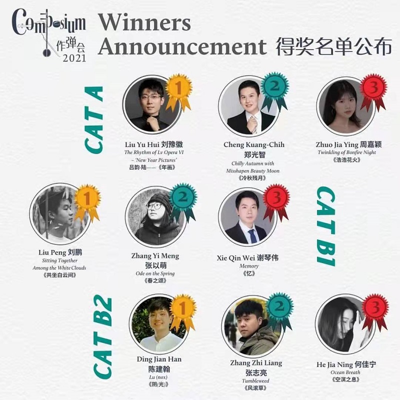 2021年12月19日,在“作弹会 2021”第四届新加坡国际华乐室内乐作曲比赛中,我系刘鹏老师的作品《共坐白云间》获得作曲奖一等奖以及“华夏璇音”最具人气作品奖,特此向刘鹏老师致以热烈的祝贺!