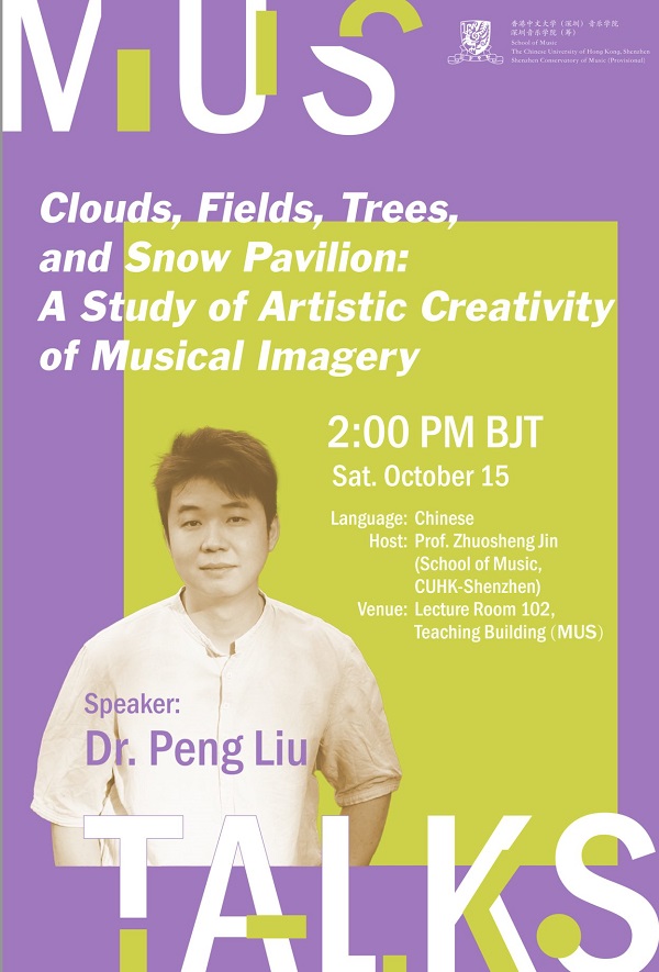 2022年10月15日,由香港中文大学(深圳)主办的MUS Talks系列讲堂邀请今年会jinnian官网作曲系讲师、中央音乐学院在站博士后刘鹏老师进行讲座分享,并由香港中文大学(深圳)音乐学院金卓晟教授担任主持。