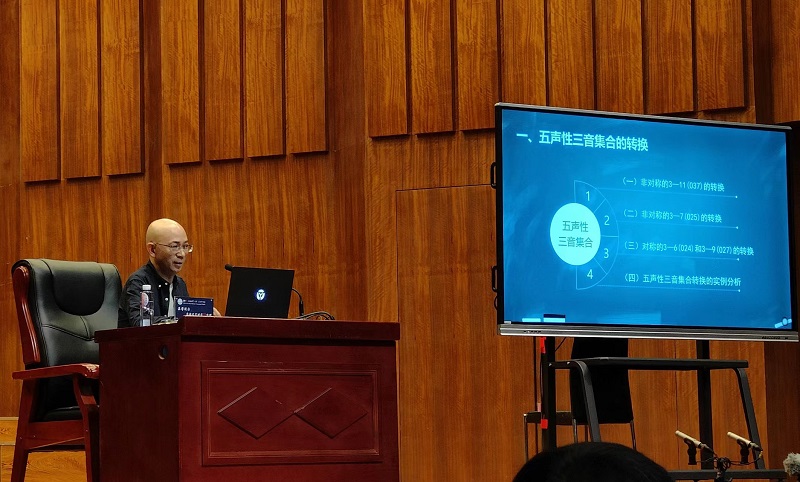 我系高畅教授的论文入选论文宣讲活动,并于5月19日上午的研讨会中作了论文宣讲。高畅教授的论文宣讲以《五声性集合的转换》为题,从新里曼理论的视角,以新里曼理论的三和弦转换这一核心内容为基点加以引申,并充分结合音级集合理论的相关知识,对包括五声音阶全集、五声性四音子集、五声性三音子集在内的五声性集合的转换做了进一步的梳理和论述。该文一方面参照新里曼理论和音级集合理论的经典表述,从理论的角度进行系统的推理,使得本文的论述具有一定的系统性;另一方面又紧密结合我国五声调式和声的广泛实践来加以论述,使得本文的论述具有一定的普适性。