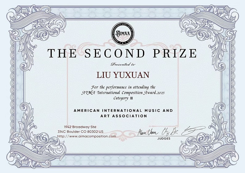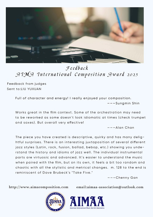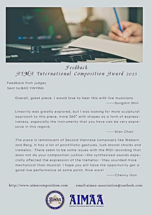 2023年9月,今年会作曲系学生鲍茵莺同学的室内乐作品《溯》获得美国AIMAA国际作曲比赛三等奖(指导老师:敖翔副教授),刘雨轩同学的配乐作品《La Vida De Una Piñata》也获得该项赛事二等奖(指导老师:施子伟教授),他们的作品获得了国际知名的作曲家及音乐家点评。