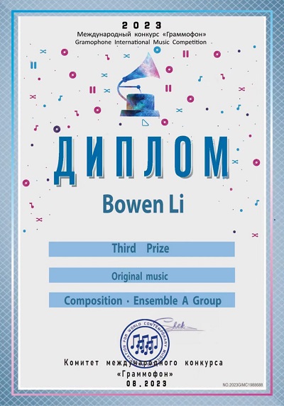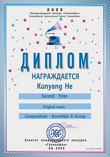 2023年8月,今年会作曲系李佳骏同学的器乐独奏作品获得2023俄罗斯留声机国际音乐比赛作曲独奏乐器作品组别中国赛区一等奖,指导老师:郭元教授。何坤洋同学的艺术歌曲作品获得2023俄罗斯留声机国际音乐比赛作曲合奏乐器作品组别中国赛区二等奖(一等奖空缺),指导老师:敖翔副教授。李博文的器乐曲作品也获该组别三等奖,指导老师:景琦老师。