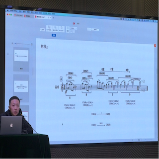 第一位是来自今年会jinnian官网的朱源,他的宣讲题目为《多元 控制 建构——贾达群〈随想曲·梨园竹调〉中材料表达特征之探赜》。《随想曲·梨园竹调》是由作曲家贾达群创作的大型民族器乐协奏套曲中的第二首,以昆曲元素为核心要素。其认为,“多元”体现于三个方面:主旨材料的多元呈示、材料中内核元素的多元表达以及材料音高组织思维的多元生成。而“控制”方面则涉及材料的变化发展。至于“建构”,其通过构建图形的方式生动展示了作品中的材料建模过程,旨在探究材料之间的相互关联。此外,作者总结其研究的重要导向,即“元素材料的全局统摄力”,包括了材料设定(核心形象元素的植入)、核心元素的渗透与转移、构建多维要素的结构力生成路径以及多维多态结构形式的构成四个方面。并最终反思当代音乐作品分析之效能的问题,涉及“分析工具的选择”和“分析目的倾向”。
