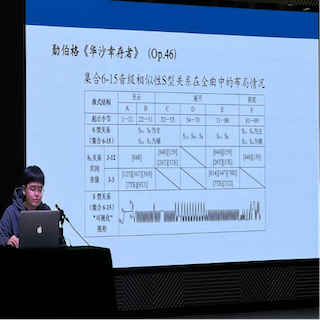 最后一位来自星海音乐学院的李天然,她的宣讲题目是《奥利维尔纳森<小提琴协奏曲>第一乐章音乐分析——兼论纳森作品中多风格技法的融合》。这篇文章将作品中重要的四音动机(0146)为线索,通过分别研究序列技术和调性思维在各结构层面中所起的作用,从两种写作思维的并存与调和中总结出纳森的创作特征。由此,作者提出三个核心问题:21世纪早已不是序列音乐的时代,但纳森在这部作品中依然坚持了序列传统,那么其中序列技术的运用特征是什么?在音高组织中,作曲家运用序列技术的同时还明确建立了调主音,那么在原本“反中心”的序列写法背景下,调性思维是怎样成型的?作曲家如何调和了序列技术和调性思维这两个因素间的冲突,形成了音乐的独特性?在其看来,纳森的序列思维体现在充分挖掘全音程四音列的潜力上,延续了序列音乐从简练的音高动机中产生多样音高材料的传统,同时并未过于偏重于数理逻辑。调式调性思维方面,纳森在保留调中心音的同时,调性听觉的生成过程与他共性写作时期有所不同,为其音乐语言增添了一份节制的浪漫主义色彩。