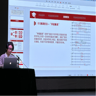 第五位武汉音乐学院马瑞浩的题目为《法·势·合——梁雷<笔法>复调技法与思维探赜》。“法”为复调技法,“势”为书法中的体态形式,“合”是音乐与书法在结构和思维之间的相互结合。文章紧密围绕着这三个主题展开。受潘天寿和黄宾虹两位书法家作品的启发,作曲家首次提出了“单音复调”技法,并将其运用于“笔墨”系列作品中。“单音复调”指单个音在不同声部之间的时间差模仿,通过变换不同的乐器组,形成不同的音响效果,进而使音乐织体变得丰富。作者还对复调技法中的其他技巧进行了具体的谱例分析和解释,包括“音乐形态模仿”、“音色对位”和“节奏重音错位”等。此外,作者还从基础笔画元素如“横、竖、点、折、撇”等方面,寻找与音乐作品的密切联系。通过将书法的艺术动态结合到音乐的韵律中,揭示了作品的审美趣味。从书法中的笔势、体势、气势等方面,找到与音乐要素和音乐材料之间的联系。