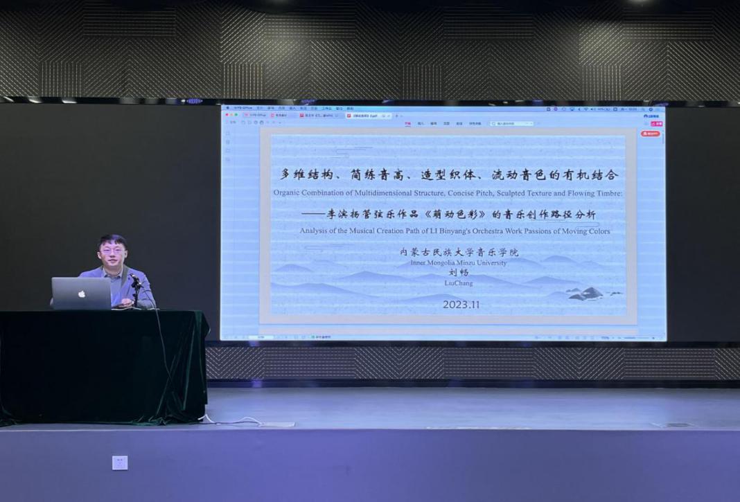 第三篇宣讲的论文,来自内蒙古民族大学刘畅的《多维结构、简练音高、造型织体、流动音色的有机结合--李滨扬管弦乐作品<萌动色彩>的音乐创作路径分析》,文章从四个部分对李滨扬管弦乐作品《萌动色彩》的音乐创作路径进行分析:一、多维结构。体现在作品运用“渐变式”布局、“黄金分割”原则及“呼应性”设计上。二、简练音高。由大小二度音程作为音高材料,体现在音组、和声及音响上并构成全曲。三、造型织体。体现在线条的造型轮廓以及单线条、多线条、带状式线条的设计。四、流动音色。体现在夸张的音响对比以及“流动而多变”的音色处理,具有多变性。结语部分作者谈到:这部作品是以乐队整体音色音响为主导的,现代音乐创作理论与中国传统音乐特征相结合,将具体的音组转化为意象的主题,不仅展示出音响运动的“墨彩交融”,还从中得出对中国传统文化意识的追求,以及简单豁达、洒脱的生活观和人生观。
