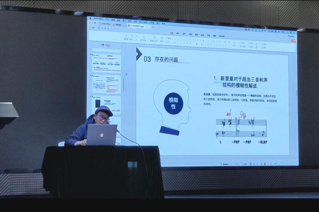 第一篇宣讲的论文,是来自武汉音乐学院王卓的《山水逶迤•阴阳轮回--梁雷管弦乐作品<千山万水>“笔墨”文化研究》,文章分为三个部分:一、音级流转中的阴阳之变。作者在文章中指出:“知白守黑”“虚实相生”巧妙实现了对立音高材料的相互转换,与中国传统文化中的阴阳哲学观念高度契合。二、山水布局中的多重结构思维。作品中引入了“不齐之齐”的章法布局,这种灵活的布局形式,同时结合对西方传统曲式原则与中国民间音乐曲式特征的思考,在不同结构比例中形成多种结构元素间的不同步对位关系。三、文化“笔墨”中的意象表达。中国传统山水画具有强烈的生命力,作曲家借此以“声景”视角,为作品赋予了更深层次的内涵与表达意义。文章还从音级的生长式移转、相对性移转讲解音高材料如何相互转换,向大家展示《千山万水》中音高旋律的阴阳太极之美;从“大曲”以及“黄金分割”展示作品的曲式结构比例设计之精妙;作品将“积墨法”运用至声部中,诠释了如何用声音之笔描绘音响画卷。