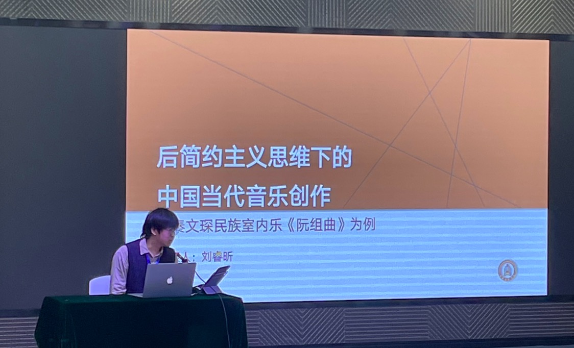 第二位是来自上海音乐学院,刘睿昕的论文《后简约主义思维下的中国当代音乐创作——以秦文琛民族室内乐<阮组曲>为例》,从四个问题进行思考与研究,分别是“为什么我们要研究后简约主义思维?”“什么是后简约主义思维?”“秦文琛的《阮组曲》是一部后简约主义作品么?(共性,个性)”以及“后简约主义思维于中国当代音乐创作有何种启发?”并且在宣讲过程中,将简约主义的美学与后简约主义美学做了详细的对比,能够很直观的看出两者之间的区别之处。谈到秦文琛的民族室内乐作品《阮组曲》,刘睿昕根据前面的提到的思考,对《阮组曲》的美学特征进行了一个总结,第一是对目的与过程的结合,其二是以极端主义思维的融合,其三则是对本土音乐素材的引用。对于后简约主义思维对中国当代音乐创作的启示,刘睿昕引用了何训田老师对中国当代音乐的看法,即“自何来,以何载,到何处”。并与德国理论家海因里希·科赫的“构思,实现,阐述”做了对应。