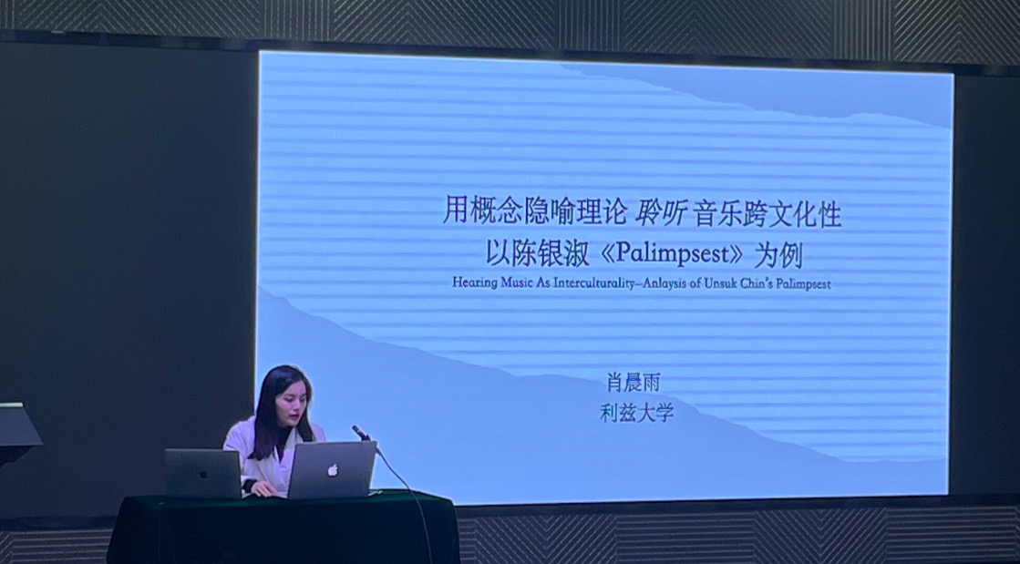 第三位是来自利兹大学的肖晨雨,论文名为《用概念隐喻聆听当代音乐的跨文化性:以陈银淑〈Palimpsest>为例》,其主要从三个部分来进行探讨。第一部分主要是从东亚作曲家的音乐跨文化性的分析现状出发,第二部分来总结出用概念领域以及从概念领域中发展而来的混合领域,第三部分主要是用其方法论来具体的分析展现,如何聆听音乐以及它的跨文化性。陈银淑的作品中,她的音乐层次的开始变化以及叠置的使用,可以类比于多种文化之间的互动和融合。并且在她的音色和技法上,能够实现肖晨雨在论文中提到的“Palimpsest”的模型当中对应的符号意义。