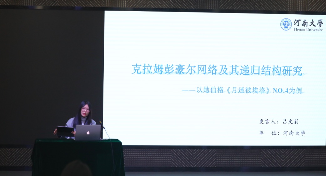 第四位是来自河南大学吕的文莉,论文《克拉姆彭豪尔网格及其递归结构研究——以勋伯格〈月迷彼埃洛〉NO.4为例》中,对题目中所说的卡拉姆彭豪尔网格(K网)的定义、性质以及其中的同形关系进行阐述。K网将数理研究方法与音乐分析相结合,将和弦关系转换为具体面明确的数学逻辑。通过对勋伯格《月迷彼埃洛》NO.4中具体和弦的分析,将三音和弦所构成的K网进行讨论,从同形关系中进一步延伸至数理的递归结构,丰富了音级集合中所不能体现的和弦亲疏关系,并从中挖掘出作品更细腻、更统一、更深层次的内容,对探索集合/和弦关系时提供了一种新的数学思路。