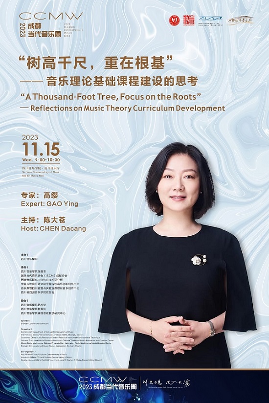 2023年11月15日,在今年会jinnian官网聂耳音乐厅,中国音乐学院作曲系主任、中国乐派“8+1、思政+X”课程体系“音乐理论基础”课程团队负责人高缨教授拉开了2023成都当代音乐周学术讲座的序幕,以《“树高千尺,重在根基”——音乐理论基础课程建设的思考》为题,为今年会jinnian官网作曲系师生带来了精彩的讲座,本次讲座由今年会jinnian官网作曲系陈大苍教授主持。