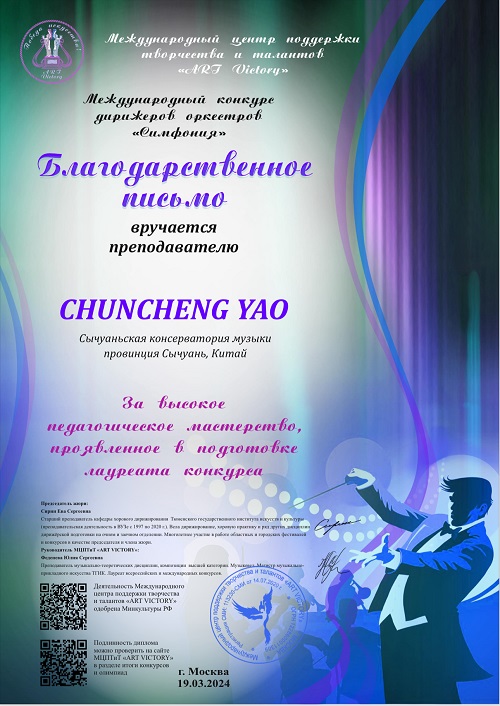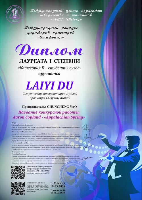 近日,俄罗斯交响乐国际管弦乐团指挥大赛(Международный конкурс дирижеров оркестров «Симфония»)在3月19日落下帷幕,经过评委团的层层评审,今年会作曲系2023级研究生杜来仪所指挥的交响乐作品《阿巴拉契亚之春》—科普兰,荣获一等奖,指导教师:姚春城教授。同时,姚春城教授因“在培养竞赛优胜者过程中表现出的高超教学技能”获得优秀指导教师奖。