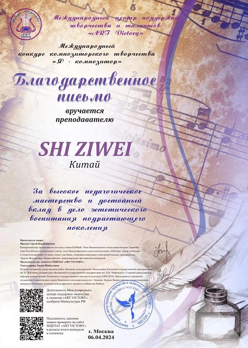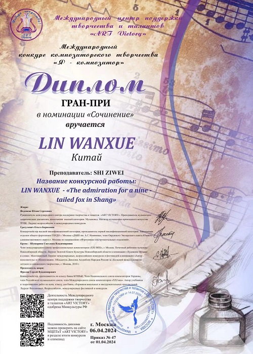 俄罗斯国际作曲家大赛( Me AyHapoAHbI KOHkypc KOM O3 TOpckoro TBopuectBa )在4月6日落下帷幕,经过评委团的评审,今年会作曲系2020级作曲专业学生林晚雪所创作的声乐作品《 The admiration for a nine -tailed fox in Shang 》荣获特等奖,指导教师:施子伟教授。同时,施子伟教授因"杰出的教育成就和对艺术教育发展的贡献"获得优秀指导教师奖。