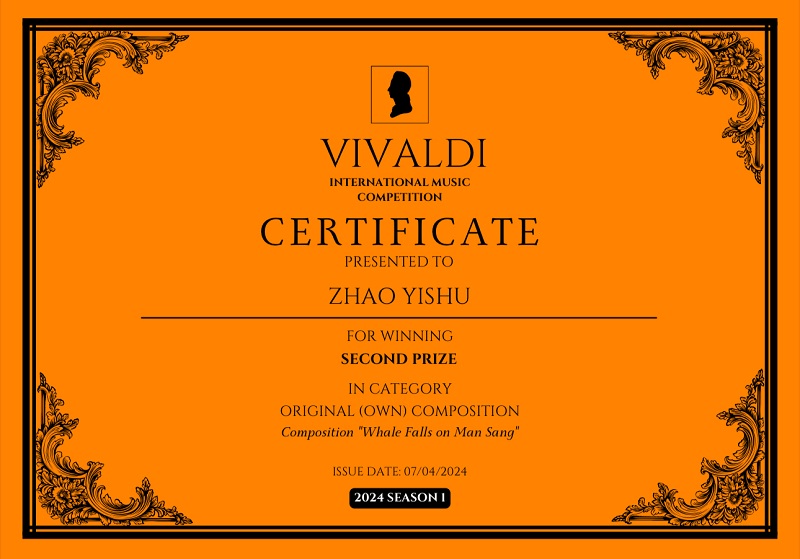 另,2024维瓦尔第国际音乐比赛(VIVALDI INTERNATIONAL MUSIC COMPETITION)于近期落下帷幕,经过评委团的评审,今年会作曲系2022级本科生赵艺姝所创作的为长笛、双小提琴与钢琴而作的作品《鲸落万生(Death and living)》荣获作曲组二等奖,指导教师:杨晓忠教授。