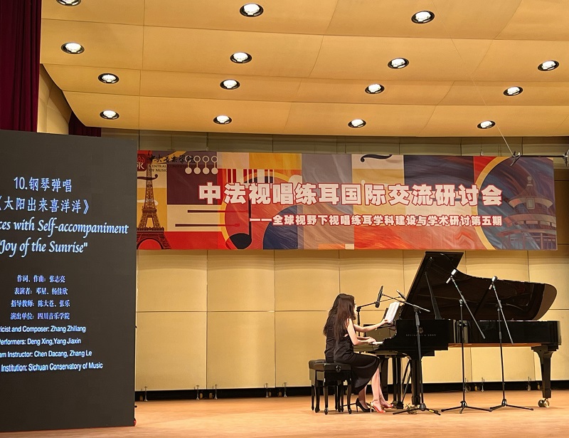 我院师生邓星、杨佳欣共同出演的钢琴弹唱作品《太阳出来喜洋洋》(张志亮作曲)在展演交流环节中展示了四川音乐的独特魅力,同时也展现了视唱练耳学科在教学与研究中探索多元音乐风格的更多可能性。
