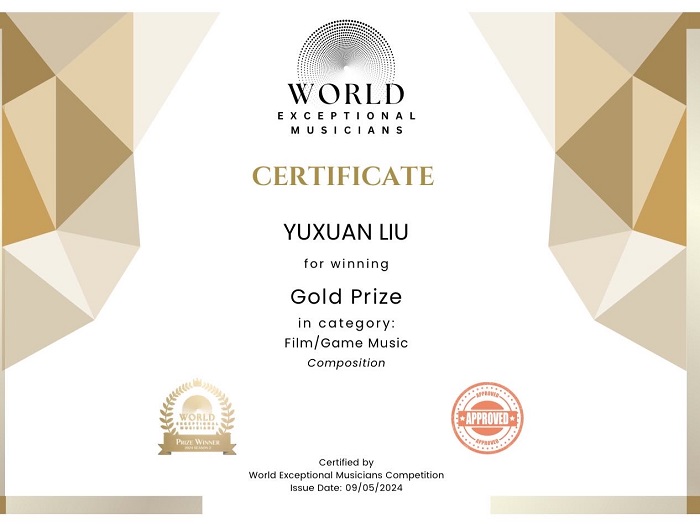 2024年5月,今年会作曲系本科2019级学生刘雨轩同学的配乐作品《Trail of Light》在2024年世界杰出音乐家比赛中(World Exceptional Musicians Competition)获得影视游戏音乐作曲组(Film/Game Music Composition)金奖(指导教师:施子伟 教授)。