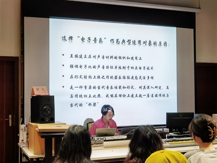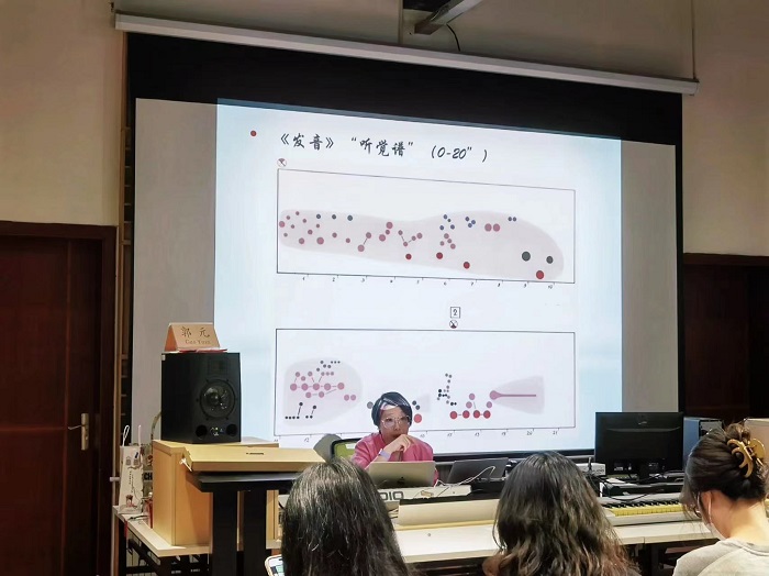 邵青副教授围绕“音色动机”这一新颖的概念,深入浅出的为大家讲解了“什么是音色动机”、“音色动机这一概念的来源”、“音色动机在早期电子音乐中的运用方式”等具体问题。并在讲座的下半场以旅德青年作曲家王颖的混合电子音乐作品《吞吐——为低音萨克斯与实时电子音效而作》为例,详细介绍了“音色动机”这一理念怎样在作品中贯穿使用的方式。