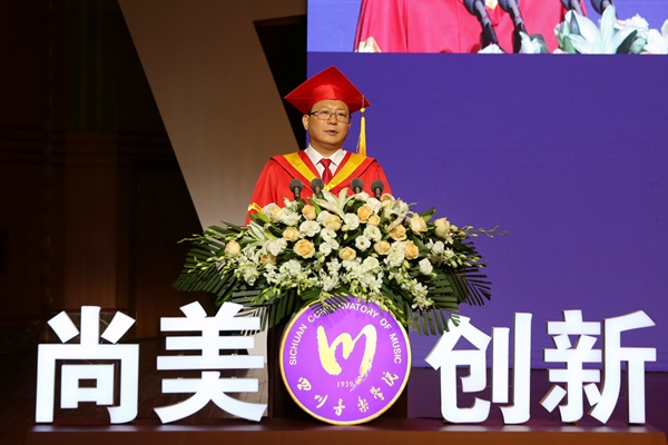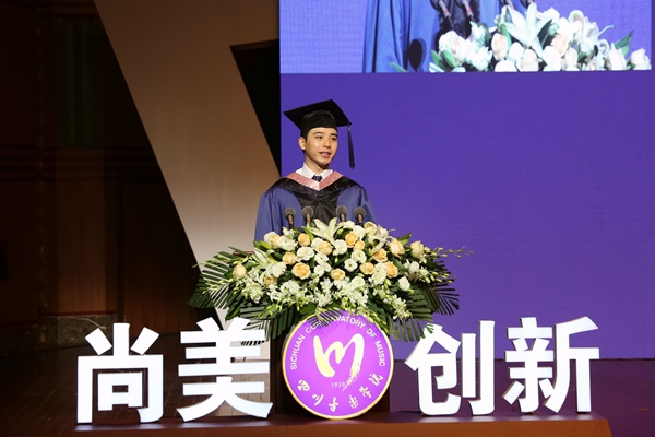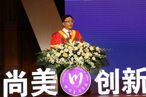 教师代表、音乐学系副主任格桑梅朵为即将远行的2020届毕业生送上老师们的希望与嘱托:希望同学要有一颗感恩的心,感恩父母在我们背后的默默耕耘和努力坚守;感恩学校,做有家国情怀的川音人;感恩老师们的传道受业、无私付出、默默奉献。要坚持脚踏实地、勤奋努力,既要有远大的奋斗目标和人生追求,也要有脚踏实地的务实精神,要牢记自己的使命和责任,不要放弃自己的理想和信念,用高尚的品德服务社会、服务人民,用求真的态度做踏实的功夫,坚守自己的追求才能抵达自己的初衷。