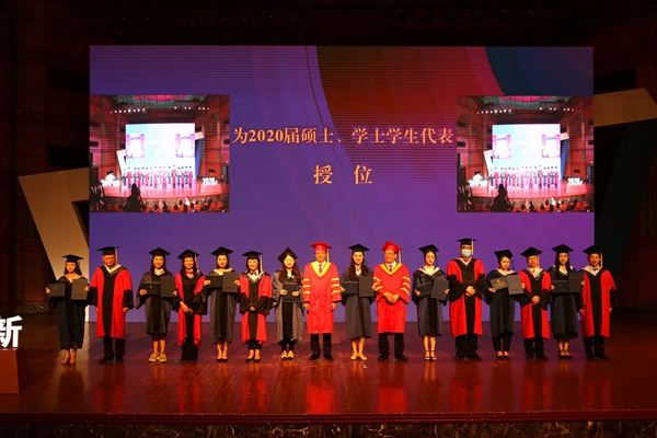 毕业研究生代表喻镭和在湖北武汉的毕业本科生代表李南曦分别通过现场发言和“云直播”的方式向母校表示感谢、向师长致以崇高敬意。他们说:大学期间,见证了学校的发展,更有幸为母校80周年的生日庆祝。毕业是一个分水岭,对我们来说意味着真正的成长,我们开始承担更多的责任,开始独自面对更多的困难,感谢母校的教育让我们有信心面对这些问题。祝福母校繁荣昌盛、英才辈出,祝福亲爱的老师身体健康、桃李满家,祝福同学们前程似锦、未来可期。