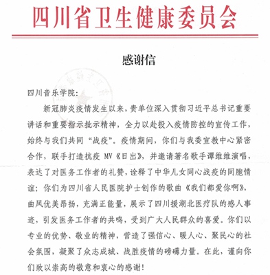 新冠肺炎疫情发生以来,贵单位深入贯彻习近平总书记重要讲话和重要指示批示精神,全力以赴投入疫情防控的宣传工作,始终与我们共同“战疫”。疫情期间,你们与我委宣教中心紧密合作,联手打造抗议MV《日出》,并邀请著名歌手谭维维演唱,表达了对医务工作者的礼赞,诠释了中华儿女同心战疫的同胞情谊;你们为四川省人民医院护士创作的歌曲《我们都爱你啊》,曲风优美昂扬,充满正能量,展示了四川援湖北医疗队的感人事迹,引发医务工作者的共鸣,受到了广大人民群众的喜爱。你们以专业的优势、敬业的精神,营造了强信心、暖人心、聚民心的社会氛围,凝聚了众志成城、战胜疫情的磅礴力量。在此,谨向你们致以崇高的敬意和衷心的感谢!
