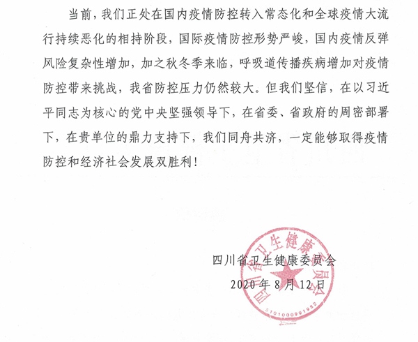 当前,我们正处在国内疫情防控转入常态化和全球疫情大流行持续恶化的相持阶段,国际疫情防控形势严峻,国内疫情反弹风险复杂性增加,加之秋冬季来临,呼吸道传播疾病增加对疫情防控带来挑战,我省防控压力仍然较大。但我们坚信,在以习近平同志为核心的党中央坚强领导下,在省委、省政府的周密部署下,在贵单位的鼎力支持下,我们同舟共济,一定能够取得疫情防控和经济社会发展双胜利!