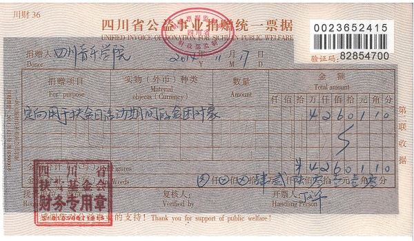 根据《四川省教育厅关于转发〈教育部办公厅关于印发〈2014年教育系统扶贫日活动方案〉的通知〉的通知》(教育厅函[2014]126号),以及关于开展厅属高校扶贫捐赠活动的要求,学院决定在全院范围内开展扶贫济困捐款活动,为此,院工会认真部署、广泛动员,积极开展活动。本次扶贫济困捐款活动在各职能部门及各院(系)在职教职工中开展,捐款活动坚持自愿原则。“扶贫日”捐款活动得到教职员工的积极响应和踊跃参与,截止到11月17日,共收到党办、院办、新校区管委办、外事处、人事处、学生处、科研处、保卫处、艺术处、总务处、国资处、工会、资产经营管理办公室、图书馆、学报社、高等教育研究所、乐器研究所、社科学院、作曲系、管弦系、声乐二系、民乐系、音乐教育学院、音乐学系、手风琴电子键盘系、公共管理系、艺术附中(校本部)、国际演艺学院、美术学院、流行音乐学院、戏剧系、戏剧影视文学系及传播艺术系等33个部门院(系)509名教职员工的捐款,共募集捐赠款42601.10元。此次捐赠款已汇至四川省扶贫基金会,作为定向用于扶贫日活动期间的贫困对象。