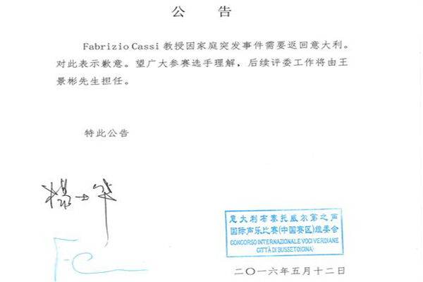 Fabrizio Cassi教授因家庭突发事件需要返回意大利。对此表示歉意。望广大参赛选手理解,后续评委工作将由王景彬先生担任。