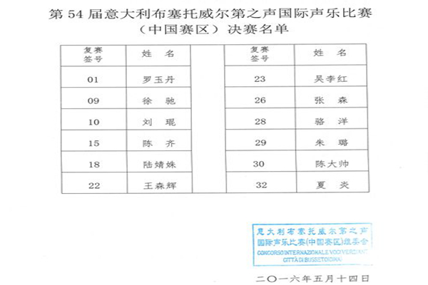 第54届意大利布塞托威尔第之声国际声乐比赛(中国赛区)决赛名单