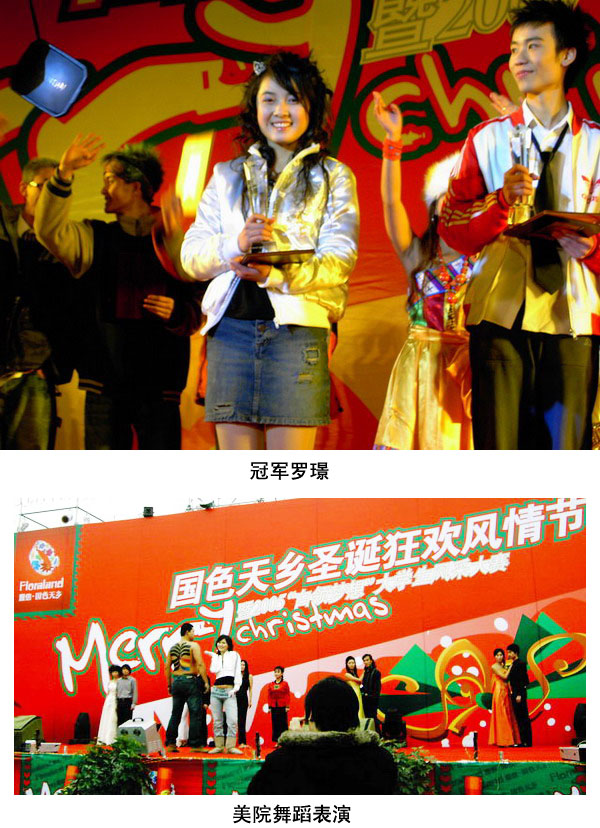 经过一个月的校园海选、网络及短信投票、现场晋级等层层选拔,倍受关注的新浪成都2005“白领梦想”大学生风采大赛的冠军在12月24日平安夜的温江“国色天乡”网络电视总决赛中脱颖胜出,3号我院学生罗璟选手击败成都其他高校的参赛选手成为了“白领梦想”的佼佼者,一举夺冠。成为万众瞩目的焦点,同时罗璟同学还获得“最佳专家印象奖”;我院另外一位前十强选手王瑞雪同学获得“最佳能力应变奖”。而多日奔波与校园的工作者张倩、刘凌、郑辉分别获的“最优秀校园记者”、“最佳参与者”、“最佳策划者”。我们学校也获的了“最佳组织奖”。 川音美院鲁书记被主办方“新浪网”聘为本次总决赛的评委参加了晚会并致辞。在晚会上川音美院舞蹈队表演了令在场观众掌声不断的《火热、诱惑、融合》。当晚川音成为成都高校中的亮点!