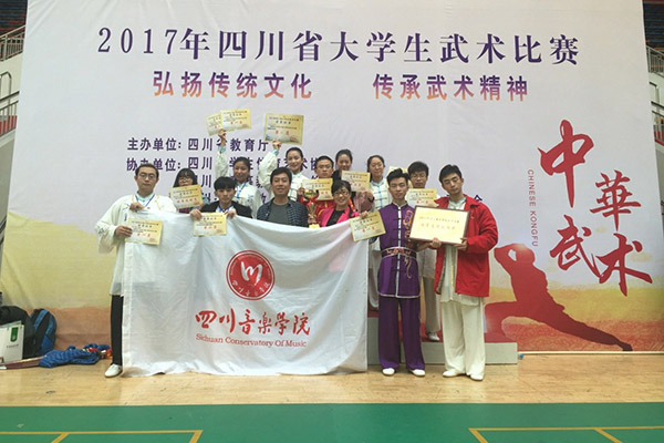 11月2日至5日,四川省教育厅主办的“2017年四川省高校武术套路比赛”在阿坝师范学院举行。由基础部副主任李杰、体育教研室主任廖恒担任领队,黄小花老师担任教练,蔡晓红老师担任随队工作人员,代表队由11名来自音乐学系、戏剧系、民乐系、公共艺术系、舞蹈学院、美术学院的参赛选手组成,获得团体C组二等奖、团体体育道德风尚奖、集体项目第八名、4个第一名、1个第二名、3个第三名、1个第四名、1个第五名、1个第八名的好成绩。