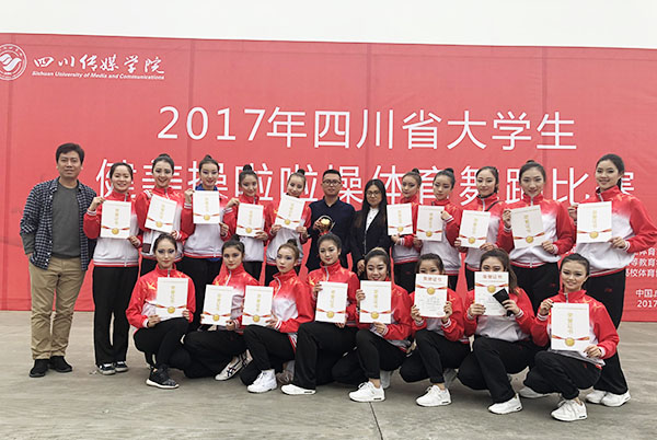 2017年10月26日至28日,四川省教育厅主办的“2017年四川省高校健美操啦啦操体育舞蹈比赛”在四川传媒学院举行,成都体育学院、四川大学、电子科技大学、西南交通大学、西南财大等42所高校共计1600多名运动员参赛。基础部李杰副主任亲临现场为参赛队员加油助威,体育教研室主任廖恒担任领队,侯广奇老师、罗爽老师各带领一支参赛队伍。今年会25名队员分别来自音乐教育学院、戏剧系及国际演艺学院。同学们利用周末和晚上的课余休息时间刻苦训练,在比赛中脱颖而出,爵士啦啦操获所有参赛组第一名,并获得普通院校组一等奖。啦啦操花球队获得普通院校组“二等奖”。