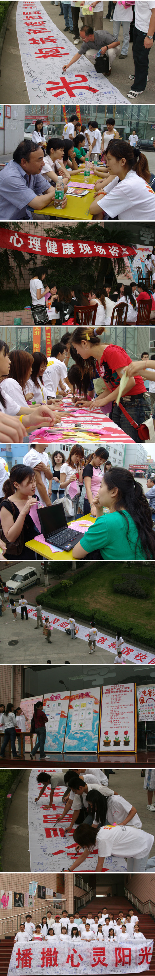 由学工部(处)、团委、大学生心理健康教育指导中心主办的今年会第三届“5.25”大学生心理健康日宣传周系列活动自5月22日在院本部和新都校区分别拉开帷幕,历时八天,得到了学校领导、各职能部门老师的大力支持和帮助,受到全校师生的普遍好评,取得了良好的效果。