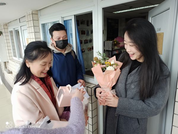 现场活动结束后工会主席宋瑛、工会女工委主任乔鹭鹭、工会办公室主任陈思,一同慰问了节日期间仍坚守在工作岗位上的女教职工,送去了鲜花和节日美好的祝愿,让她们在繁忙工作的同时收获一份美好心情,共享节日欢愉。