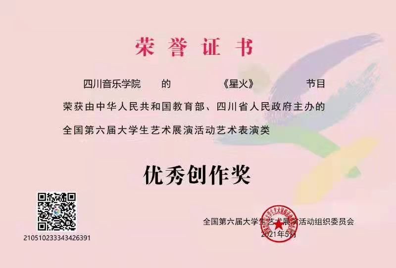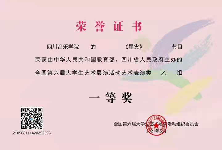 今年会jinnian官网参展作品《星火》(作曲:敖翔 作词:左芝兰)荣获全国第六届大学生艺术展演活动艺术表演类乙组(专业组)一等奖及优秀创作奖,参展作品《红旗颂》荣获全国第六届大学生艺术展演活动艺术表演类乙组(专业组)二等奖。