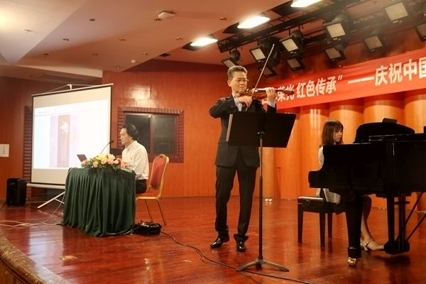 敖昌群教授首先从根据年仅23岁的共产党员赵云霄烈士临刑前给襁褓中的孩子喂奶的油画《母亲》而创作的《b小调小提琴奏鸣曲》讲起,作品讴歌了无数革命先烈为了崇高理想和革命事业抛头颅洒热血献出自己宝贵生命的伟大革命精神。为达到理想效果,敖昌群教授特邀我院著名小提琴演奏家李开祥教授现场倾情演绎,悠扬的琴声感动了在座的每一位听众,演奏结束,台下响起长时间热烈的掌声。