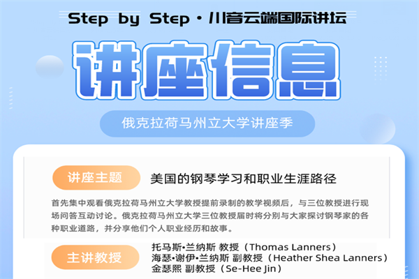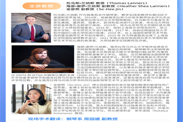 主讲嘉宾:托马斯•兰纳斯博士,俄克拉荷马州立大学格林伍德音乐学院钢琴教授;海瑟•谢伊•兰纳斯,俄克拉荷马州立大学格林伍德音乐学院钢琴副教授;金瑟熙博士,俄克拉荷马州立大学格林伍德音乐学院钢琴副教授