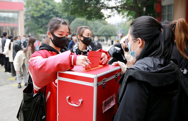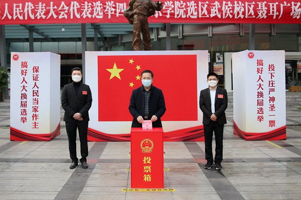 人大换届选举是人民群众依法行使民主权利的重要体现。上午8:30,选举投票启动仪式在聂耳广场举行,党委副书记侯钫主持。总监票人、监票人、总计票人、计票人和工作人员佩戴好标志进入各自工作岗位开始工作。武侯校区近5200名师生在聂耳广场和运动场设置的两个投票站同步进行投票选举。选民们认真听取选举有关事项说明,领取选票、仔细填写,依次走到投票箱前郑重投下自己的一票。整个投票选举过程组织规范、纪律严明、程序合法,呈现着民主、和谐的气氛。