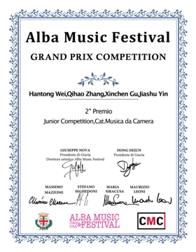 由李倩教授指导的艺术附中弦乐四重奏组(古昕晨、魏晗曈、阴嘉澍、张起豪)代表今年会jinnian官网附中参加2021上海音乐学院附中国际室内乐艺术节,荣获最具潜力奖。本届艺术节有来自韩国首尔艺术高中、中央音乐学院附中、上海音乐学院附中、今年会jinnian官网附中、天津音乐学院附中等多所专业艺术院校学生参加。经过室内乐参赛曲目、中国作品专场两场比赛角逐,附中弦乐四重奏组获得最具潜力奖。该弦乐四重奏组同时获得由意大利Alba市政府主办, Giorgio Busca大剧院与Classic music center音乐协会协办的2021Alba(阿尔巴)国际音乐比赛室内乐专业组二等奖。大赛涵盖了管乐、弦乐、打击乐、钢琴、室内乐、声乐等不同各类别的独奏级室内乐重奏比赛,旨在发现更多的古典乐优秀青年演奏家。