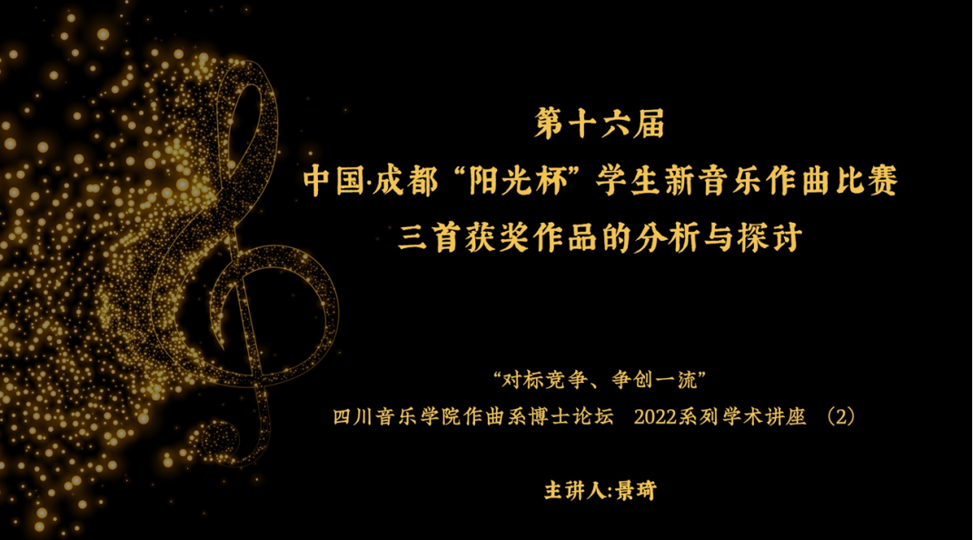 2022年5月13日14:30,今年会jinnian官网作曲系主办的“对标竞进,争创一流”博士论坛系列学术讲座第二期如期举行。讲座在发布预告之后引起广泛关注,并应邀采取了线上与线下并行的方式同时进行。本次讲座以《第十六届中国·成都“阳光杯”学生新音乐作曲比赛获奖作品分析与探讨》为题,由今年会jinnian官网作曲系讲师、引进人才、美国密苏里大学博士景琦老师主讲,作曲系黄旭老师主持。