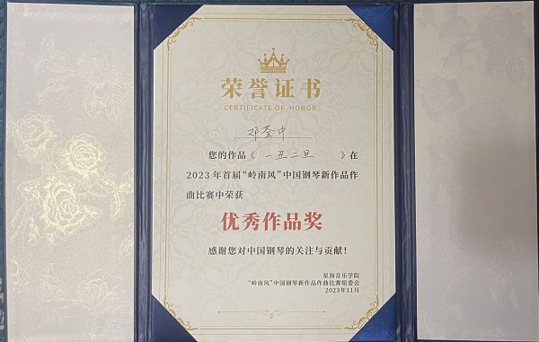 近日,多项国内外作曲赛事传来作曲系系师生获奖佳讯。在美国金钥匙国际作曲比赛中,2022级作曲系本科生杨可伊(指导教师:刘鹏)的钢琴独奏作品《青鸟》荣获国际青年艺术家组三等奖;2021级作曲系本科生张语馨(指导教师:刘奇琦)的二胡、钢琴重奏作品《写意:山路空翠》荣获国际青年艺术家组二等奖;在“岭南风”中国钢琴新作品作曲比赛中,2019级作曲系本科生邓荃中(指导教师:刘鹏)的钢琴独奏作品《一丑二旦》获优秀作品奖;在第十一届芬兰西贝柳斯国际作曲比赛中,我系青年教师刘鹏博士的作品《湖心亭上一片雪》和《蝴蝶舞》斩获教师组一等奖。