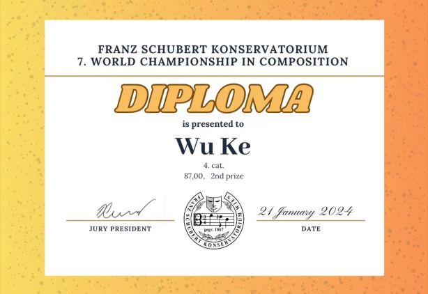 近期,在奥地利维也纳举办的第七届世界作曲锦标赛落下帷幕。此次赛事经过激烈的角逐和评委团的细致评审,作曲系2022级研究生邬可(导师:施子伟教授)所创作的室内乐作品《梦境的奇异共振》及古典吉他作品《破晓》分别荣获室内乐组二等奖(一等奖空缺)和独奏乐器组三等奖。