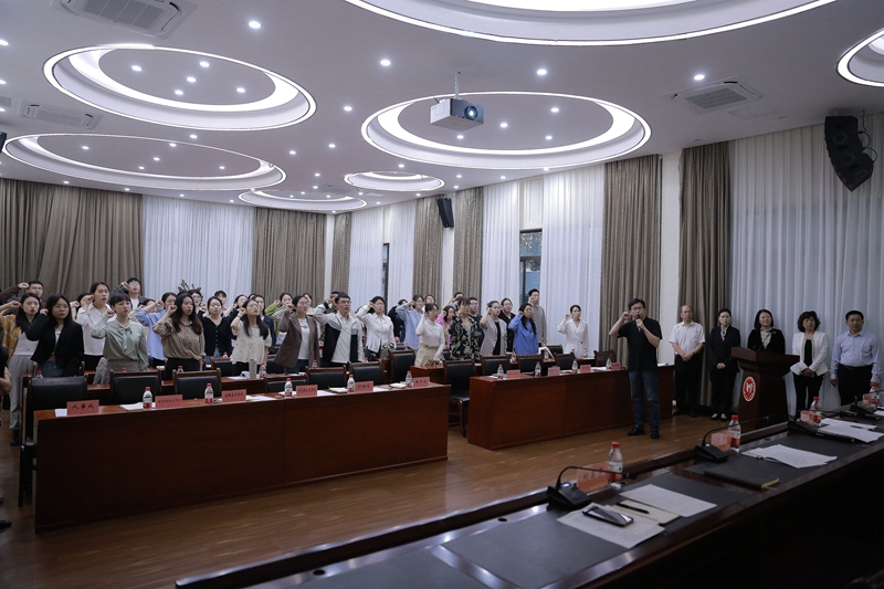在新引进并任管弦系主任李沛的领誓下,全体新进教职工进行了庄严的入职宣誓。新进教师代表、民乐系副教授李仓枭作了热情洋溢的发言,表达了新进教师们的共同心声和爱校护校、立德树人的决心。
