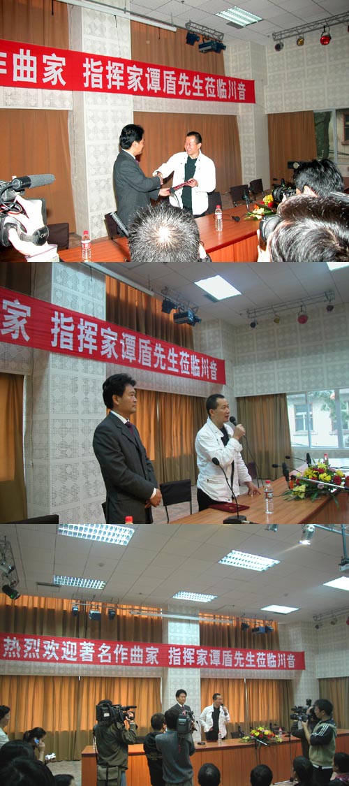 2004年10月20日上午,著名作曲家、指挥家谭盾先生莅临我院,进行短期访问,在见面会上,谭盾先生以独特的视角讲了当代音乐的创作问题,激起全场师生的热烈掌声。会上,谭盾先生向学院图书馆赠送了他自己作品DVD,学院院长敖昌群教授代表学院向谭盾先生颁发了客座教授的聘书,谭盾先生为成为川音的一员感到非常高兴,表示一定要为川音贡献自己的力量。